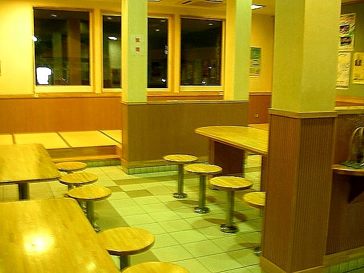 左側の広場に隣接した軽食コーナーには畳のスペースも。人気はオリジナル・バーガーとホタテの串焼き。