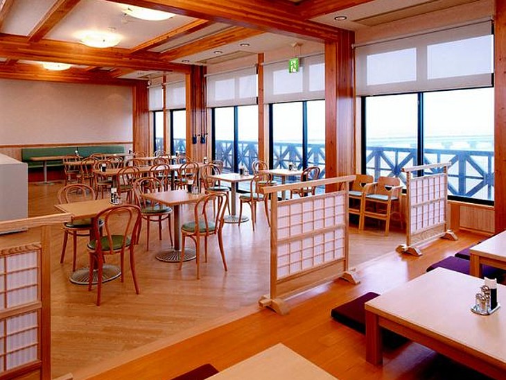 海側に大きく窓を配置した食事処「はまなす」。数回の値上げで魅力が少し薄れてしまったのは残念だが。