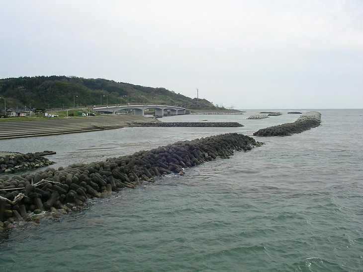 右手にもテトラの防波堤が続き、小さな漁港がある船溜りの上を「夕日ライン橋」が跨いでいる。