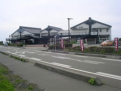 左: 海に向って駅舎の左側には日本海夕日公園・右側には出雲崎漁港が隣接しており、旧街道沿いに点在する史跡まで駅の一部と考えれば