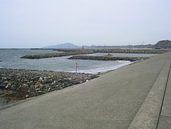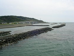 右: 橋の付け根から出雲崎漁港の方向を。波が荒い地域らしい、防波堤が何重にも巡らされている。遠くに見えるのは東麓に弥彦神社がある