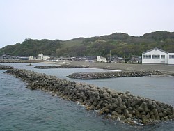 右: 右手にもテトラの防波堤が続いている。小さな入江の奥に船溜りがあり、その上を「夕日ライン橋」が跨いでいる。歩道のあるこの橋から