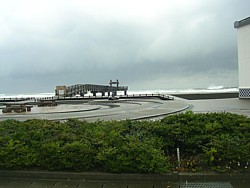 左: 曇天なので余り鮮明ではないけれど、「夕凪の橋」展望台から約50km離れた佐渡ヶ島の全景。佐渡空港への航空便の他に新潟港〜両津港、