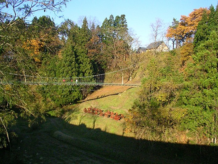 駐車場奥の吊り橋を渡ると自然豊かな里山の遊歩道が続き、丘の上には数棟の貸別荘がある。