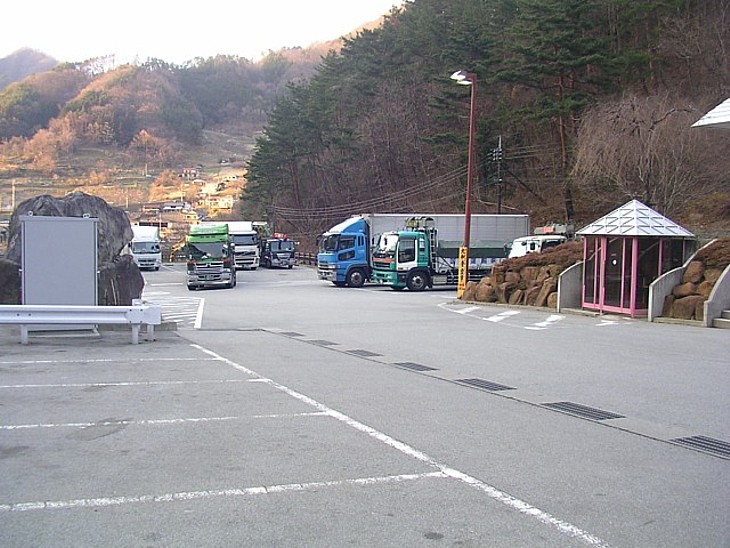 国道から入って正面と左が大型車用の駐車場。画像右奥に駅の裏へ回りこむ道路が通じている。