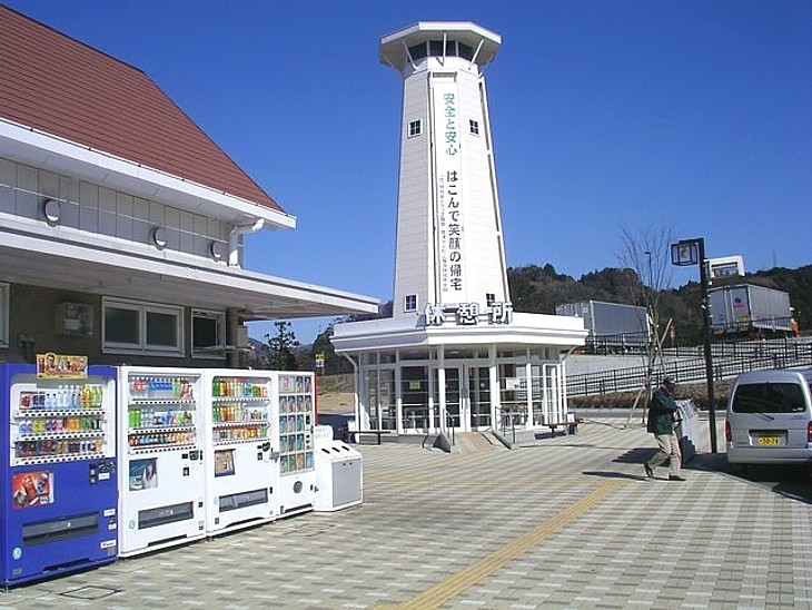 一番道側出入口の横には自販機が並ぶ。その奥にある別棟(塔の下)の休憩室は24時間利用できる。