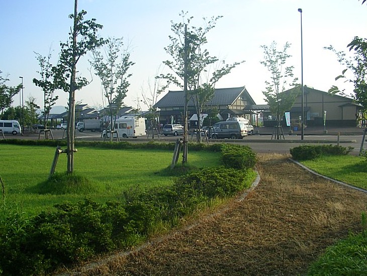 「休憩広場」の遊歩道から駐車場を隔てて左の「穂波の里物産館」と右の「穂菜味亭」を撮影。