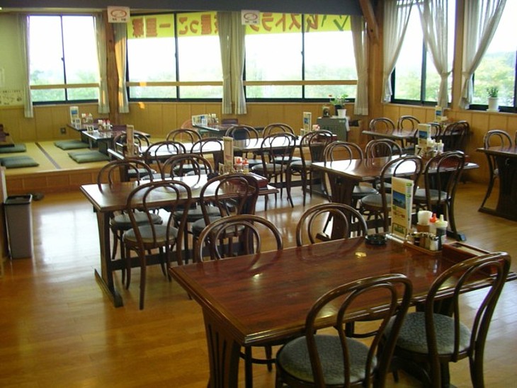 見晴らしの良い食事処は物販コーナー奥から階段を登る。落ち着いた雰囲気で畳のスペースもある。
