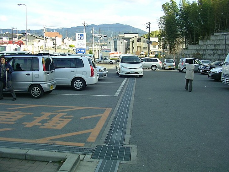 駐車場は狭い。区分帯の奥行きも浅く車路の巾もギリギリなのでキャンピングカーの駐車には少し苦労する。