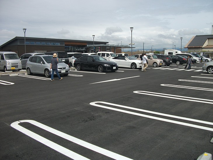 駅舎前のメイン駐車場からアプローチ方向を。右手が隣の「わさび屋」で共有通路から往来ができる。