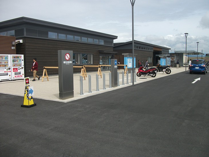 駅舎前にはバイク専用の駐輪場と自転車用の架台がある。狩野川沿いの専用道を走るサイクリスト用だ。