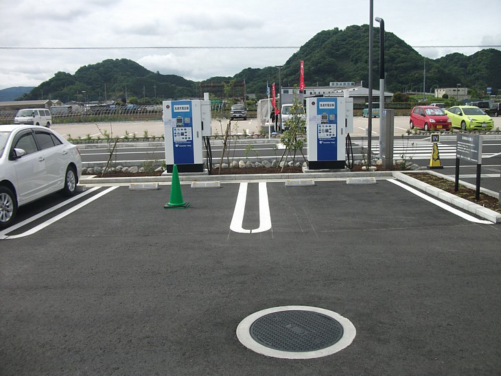 駐車場の隅にはEV用の急速充電装置を二基備えている。問題は多いが、電気自動車の普及は素晴らしい。