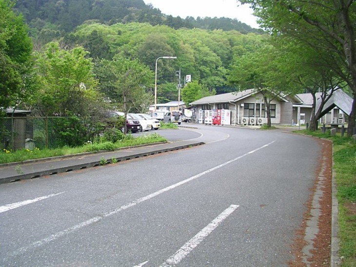 進入路の右側は広場に続く緑地。メイン駐車場は国道に面しているが、迂回して裏から入る。