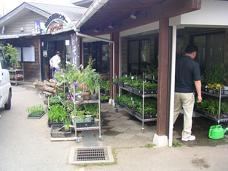 店頭の園芸コーナーでは主に山野草の小鉢を扱っている。この日は東洋ランが多く並んでいた。