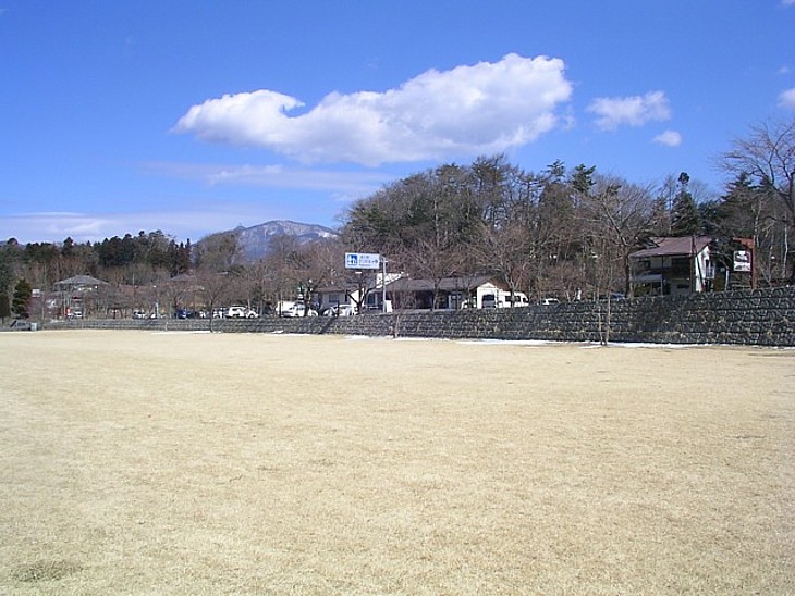 湖畔の芝生から駅舎周辺の全景を。背後に見えるのは湖東の霜山(1302m)だろうか。