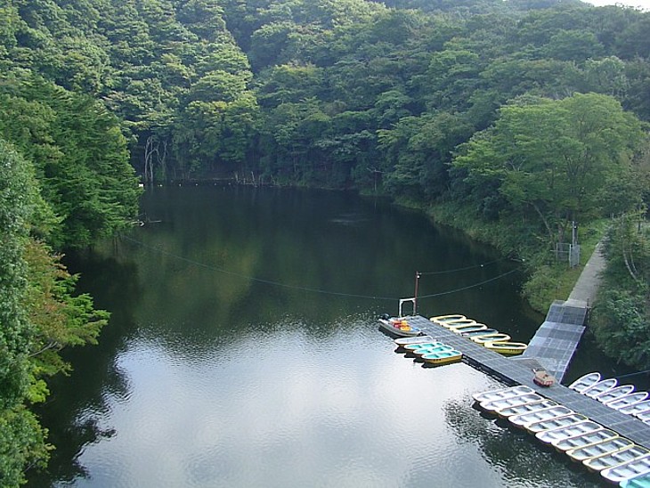 ダム記念館横の笹川に架る姿美寿橋から下流のダム湖側を撮影。バス釣りのボート桟橋が見える。