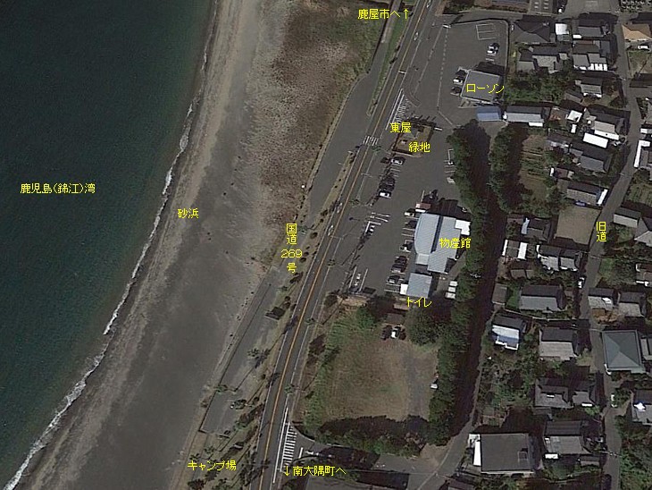 錦江湾に沿った小さな道の駅、目の前に広がるゴールドビーチ大浜海水浴場の水平線に浮かぶ桜島。