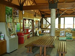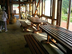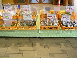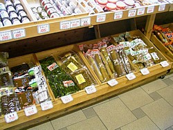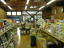9〜18時半(12〜3月は〜18時)、山里の産品が多いが問屋からの仕入れ商品が大部分で駅のオリジナルは少ない。 | |