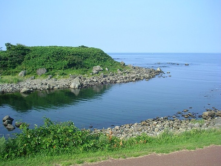 入り江の先600mに象潟漁港、その先にキャンプ場を併設した象潟海水浴場、。羽越本線象潟駅も近い。