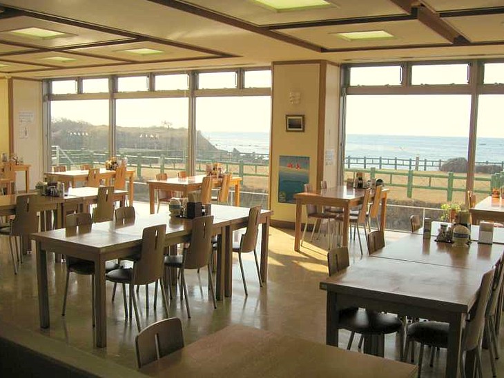 海が見える二階の食事処は比内地鶏丼や刺身定食が人気。夏は天然の岩牡蠣、冬は鱈鍋やハタハタ鍋もある。