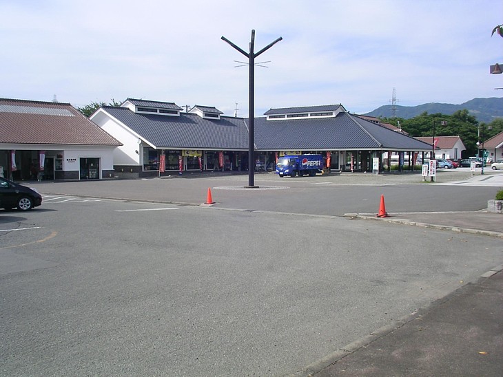 物産館と食事処がある駅舎中枢。ポール周辺は駐禁、左奥が山車などを展示する四季彩館、右奥に「蔵の湯」。