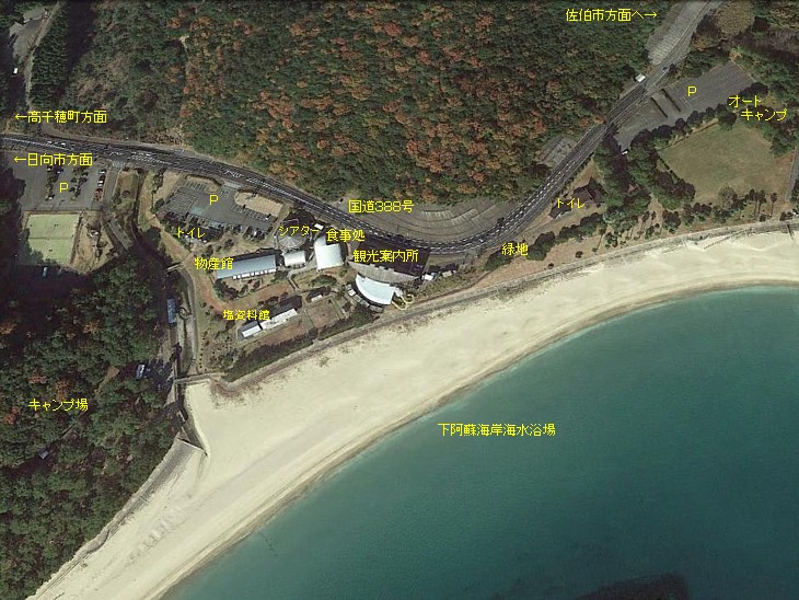 九州で最も美しい海水浴場と評判の下阿蘇海岸。緑地も広く海鮮料理も美味い、滞在型のレジャー施設だ。