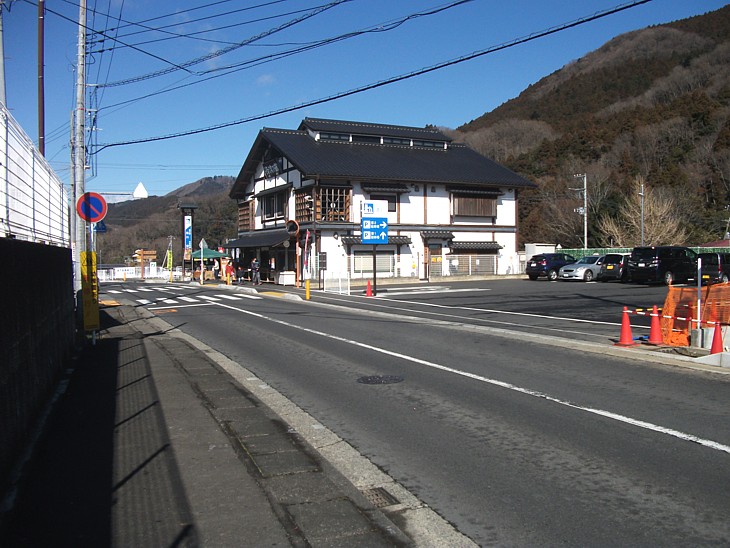 国道246号方面から道の駅へ。左上は一段高い場所に建つ清川村役場、駅舎手前が第一駐車場になる。