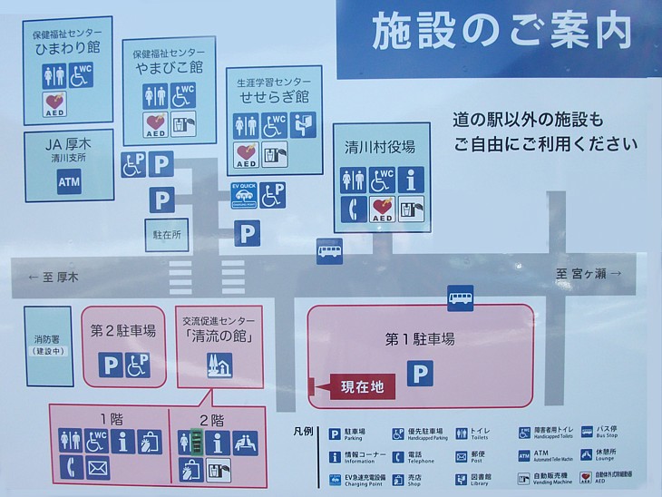 周辺の案内図。「道の駅以外の施設もご自由に...」は女性用トイレや階段昇降機に共通する配慮だろう。