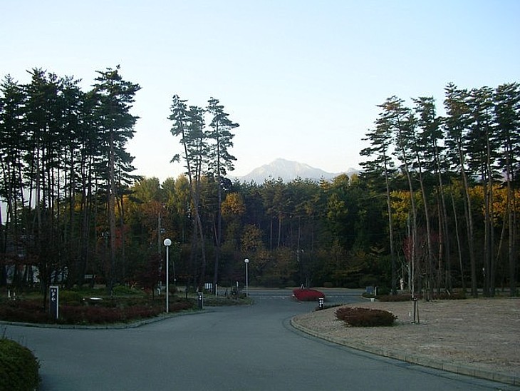 ホテルのフロント前から。針葉樹林の上には甲斐駒ヶ岳(2967m)が遠望できる。