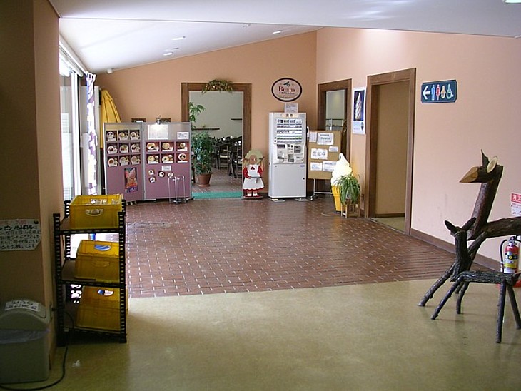 正面入口を入った突き当たりに清潔なトイレ。左にレストラン、写真の手前側が物販コーナー。