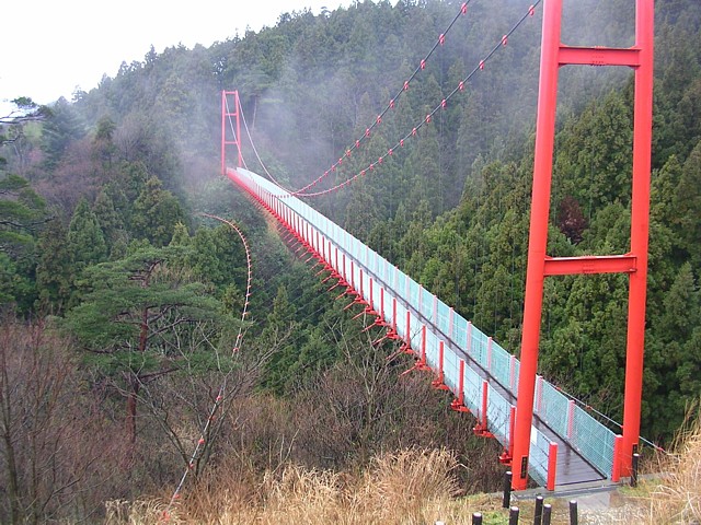 越後平野を見渡す展望台から「五合庵」近くに渡る千眼堂吊り橋。長さは124mで巾1.5m、朱色が美しい。