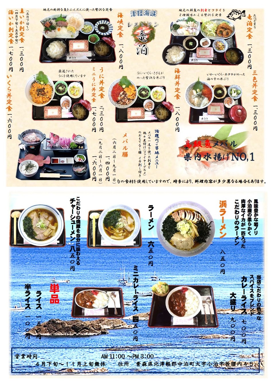 北津軽郡中泊町小泊字折腰内45 0173-27-9300 4/中旬〜11/上旬のみ営業 国道339号沿 日本橋から一般道で756km