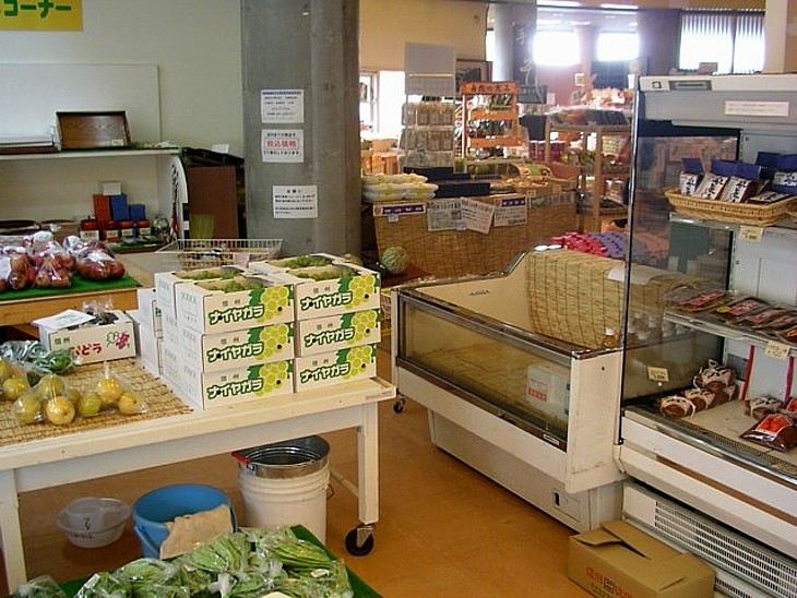 売店は広くないが商品は豊富で価格も比較的リーズナブル。夏〜秋には地元の果物や加工品が豊富に並ぶ。