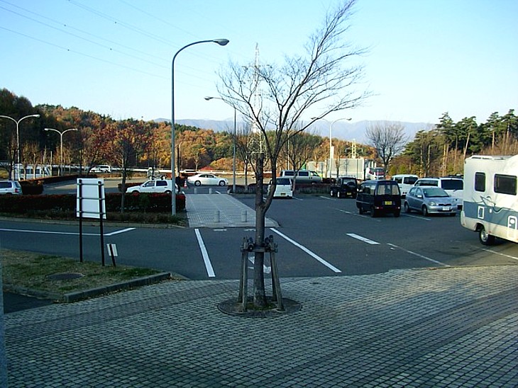 駅舎の前から国道の方向を撮影。国道を越えた背景の森には自然の豊かな小坂田公園が広がる。