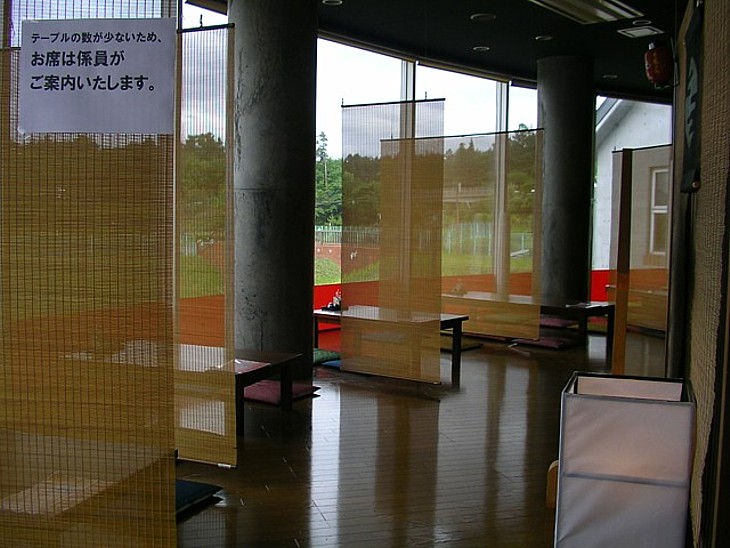 食事処の茜里(せんり)。靴を脱いでフローリングに座布団、簾の仕切りという和洋折衷の凝ったレイアウト。