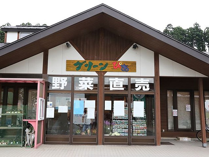 別棟の産直野菜売り場「グリーン・ぴあ」の外観。園芸花卉や関連商品も扱っている。