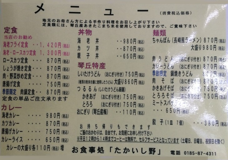「たかいし野」は11時〜15時、メニューは平凡で特徴はないが雰囲気は落ち着いている。詳細メニューはこちらで。 | |