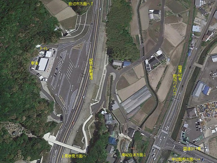 紀勢自動車道のSA。熊野古道(中辺路街道と大辺路街道)の入口として古くから口熊野と呼ばれていた。
