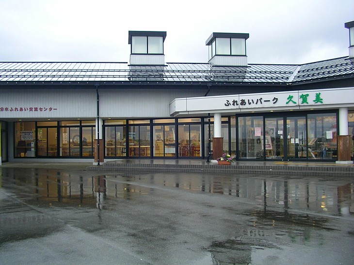 入口前に三条地場産業の展示コーナー、左に休憩室と食事処、駅舎の左奥が農産物の直売所。