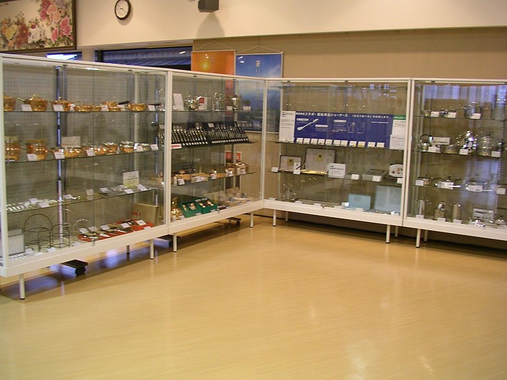 入口近くのショーケースには燕市の地場産業である洋食器や金属加工の製品などが並んでいる。