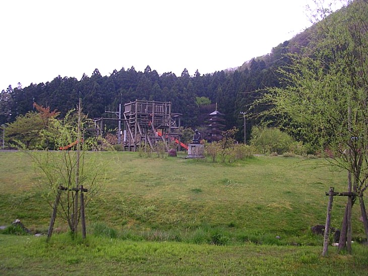 酒呑童子神社がある南西の山裾には緑地が広がり、遠くにアスレチック施設と五重塔が見える。
