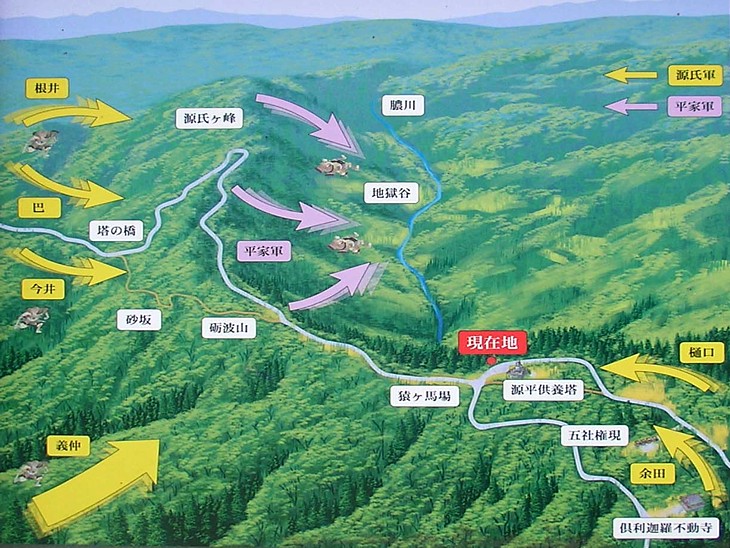 源平両軍の配置図。平家軍は地獄谷に蹴落とされたと言われるが、合戦を面白く脚色した創作に過ぎない。