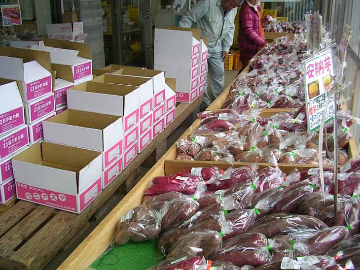 この地域特産のサツマイモが山積みで売られている。箱入りを複数買う客も多く、かなり有名らしい。