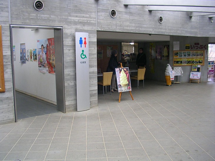 自動ドアの内側にトイレ・軽食と休憩コーナー・食事処が並ぶ。夜間も開放され自由に利用できる。