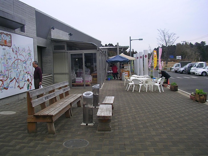 休憩室入口の前からメイン駅舎の方向を。石畳部分が広く、天気が良ければ休憩にも利用できる。