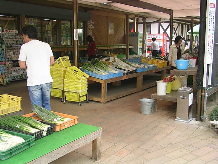 人気の高い吹き抜けの産直野菜の売場。価格は安めで品数は豊富、もちろん新鮮だ。