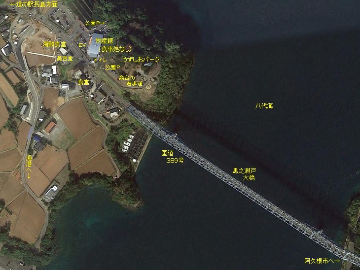 大橋の直下を流れる「黒之瀬戸」の急流、豊富な海の幸と海峡の展望が楽しめる、新しい道の駅。