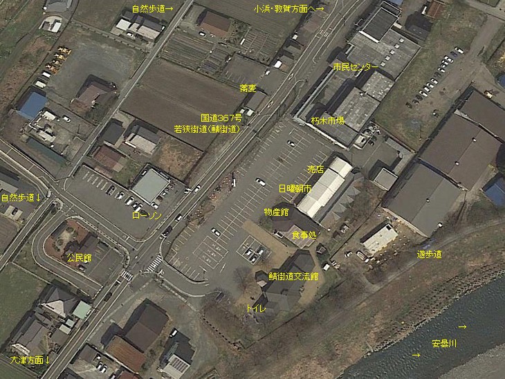 小浜と京都を結ぶ若狭街道(鯖街道)に沿った道の駅。13km北で福井県に入り、街道沿いの熊川宿に至る。