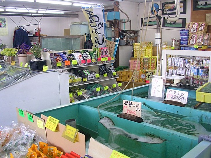 最も大きな売店「マルダイ」の店内と店頭の干物。「ばんや」には完全に差をつけられている。