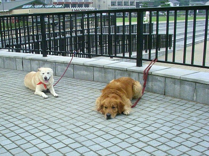 犬どもは広い石畳で一休み。須崎側には砂浜が続き、犬の水浴や磯遊びも楽しめる。